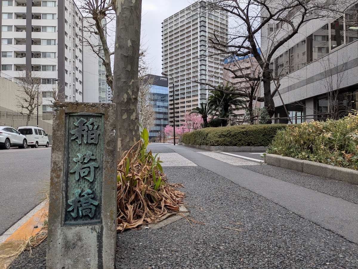 現在、川の跡地の一部は桜川公園として整備されています。また、鉄砲洲通りには今も稲荷橋の橋名板が残っています。道端に欄干の一部のようなものがあって「ん?」となったのですが、八丁堀の歴史を知って納得です。