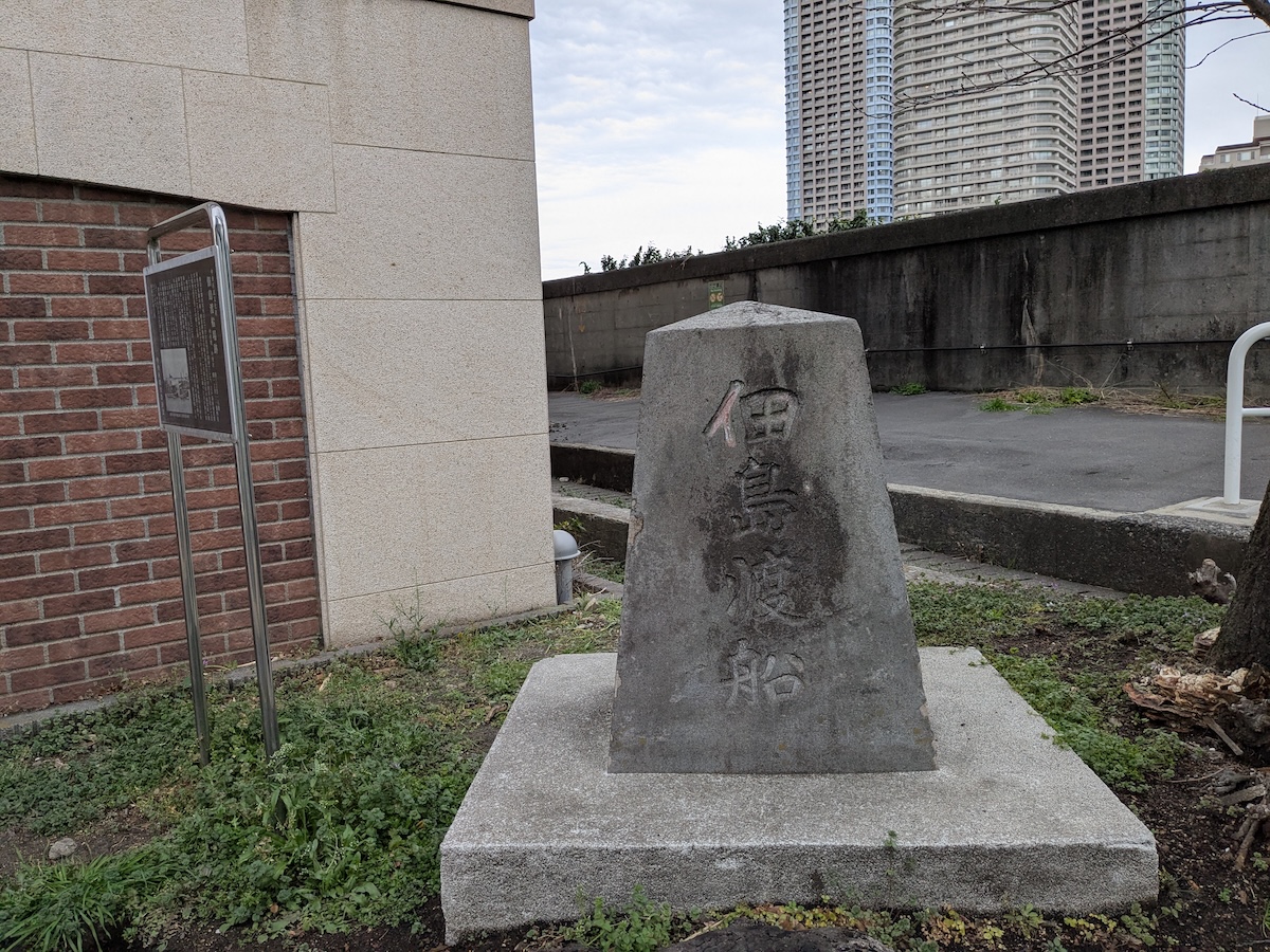 汐見地蔵尊から再び亀島川沿いの遊歩道に戻って南下していくと、隅田川にかかる佃大橋のたもとに着きます。橋のたもとに、ひっそりと石碑がありました。佃島渡船場跡之跡碑です。