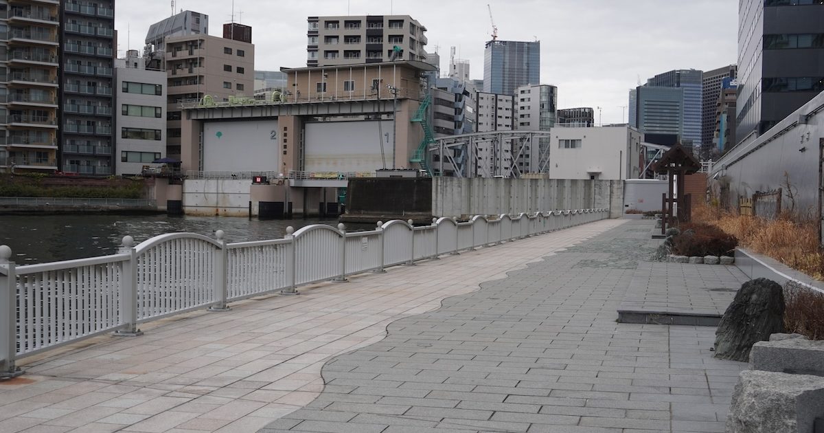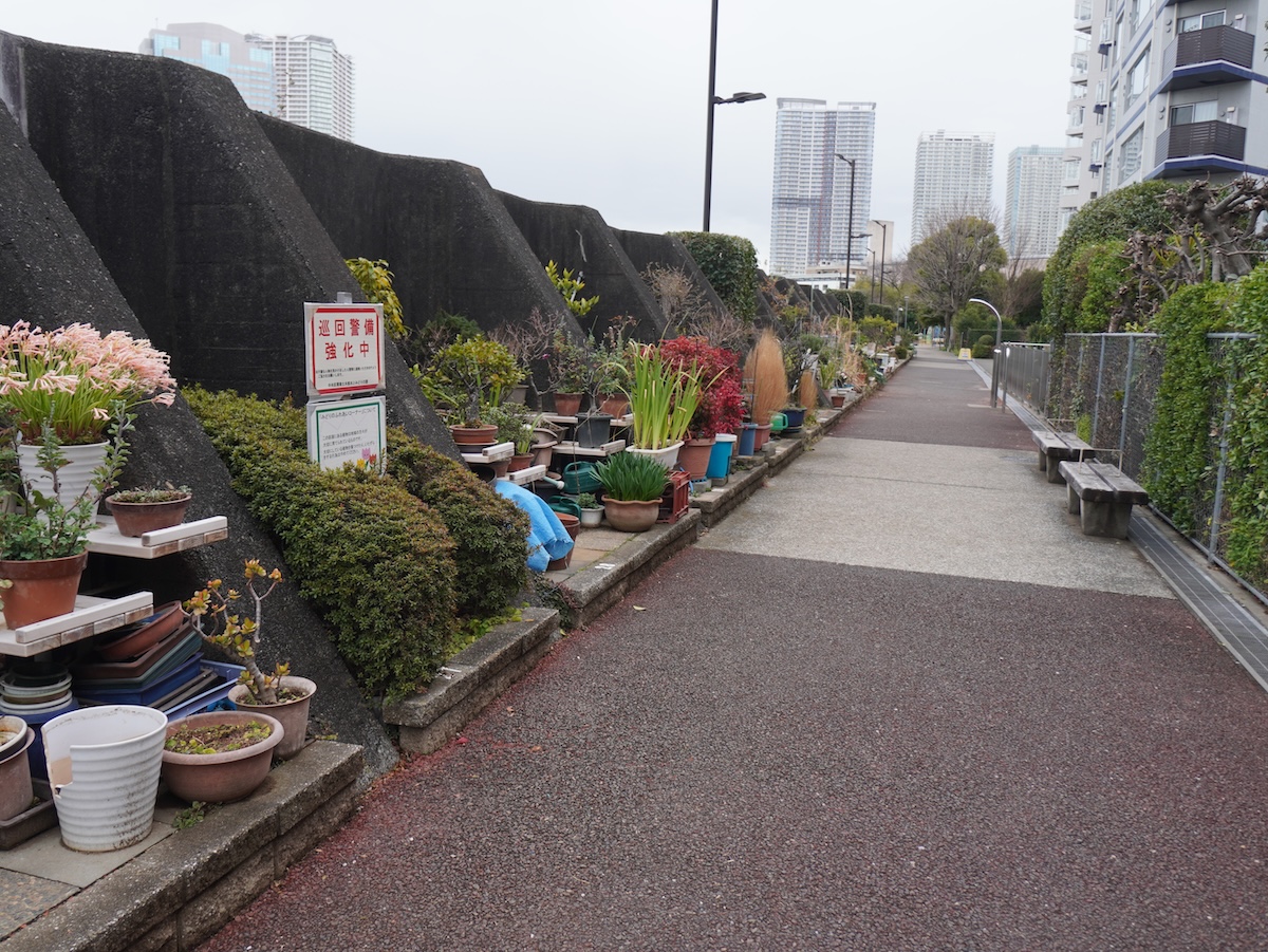 川沿いの防波堤には多くのプランターが置いてありました。近隣の住民が世話をしているのか、区画ごとに異なる植物が育てられていました。やがて佃三丁目公園に到着し、公園に隣接して佃ポンプ所がありました。