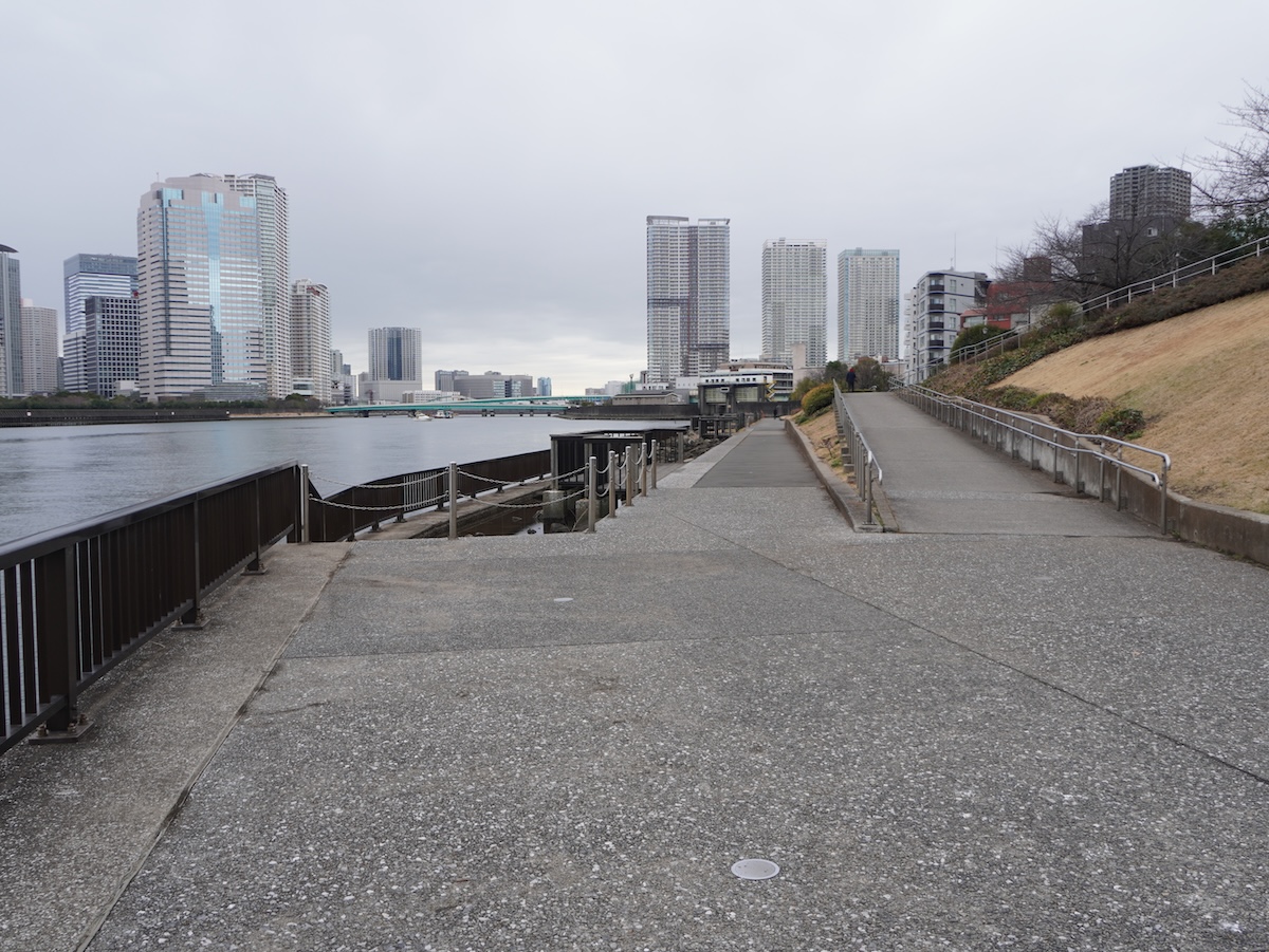 晴海運河沿いを気持ち良く歩いていたのですが、相生橋を過ぎた先で行き止まりになっていました。奥に佃水門が見えますが、まっすぐ進むことはできないようです。そこでいったん戻り、別の道を進みます。