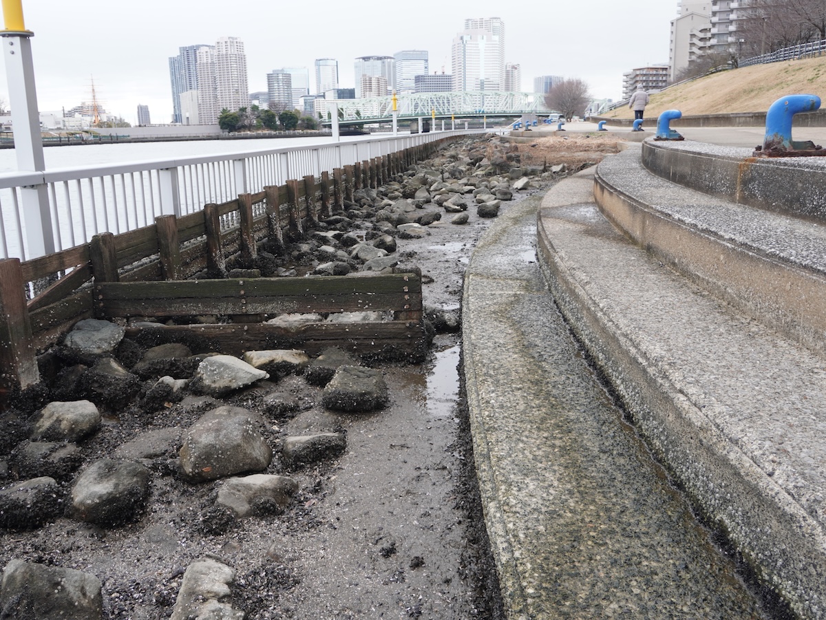 さらに石川島公園を晴海運河沿いに進むと、人口の干潟が現れました。この干潟は石川島公園の終わり付近まで点在していました。