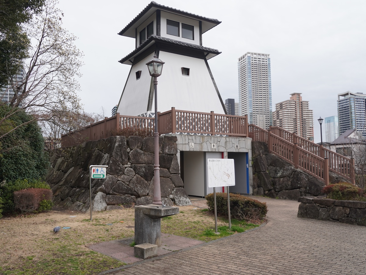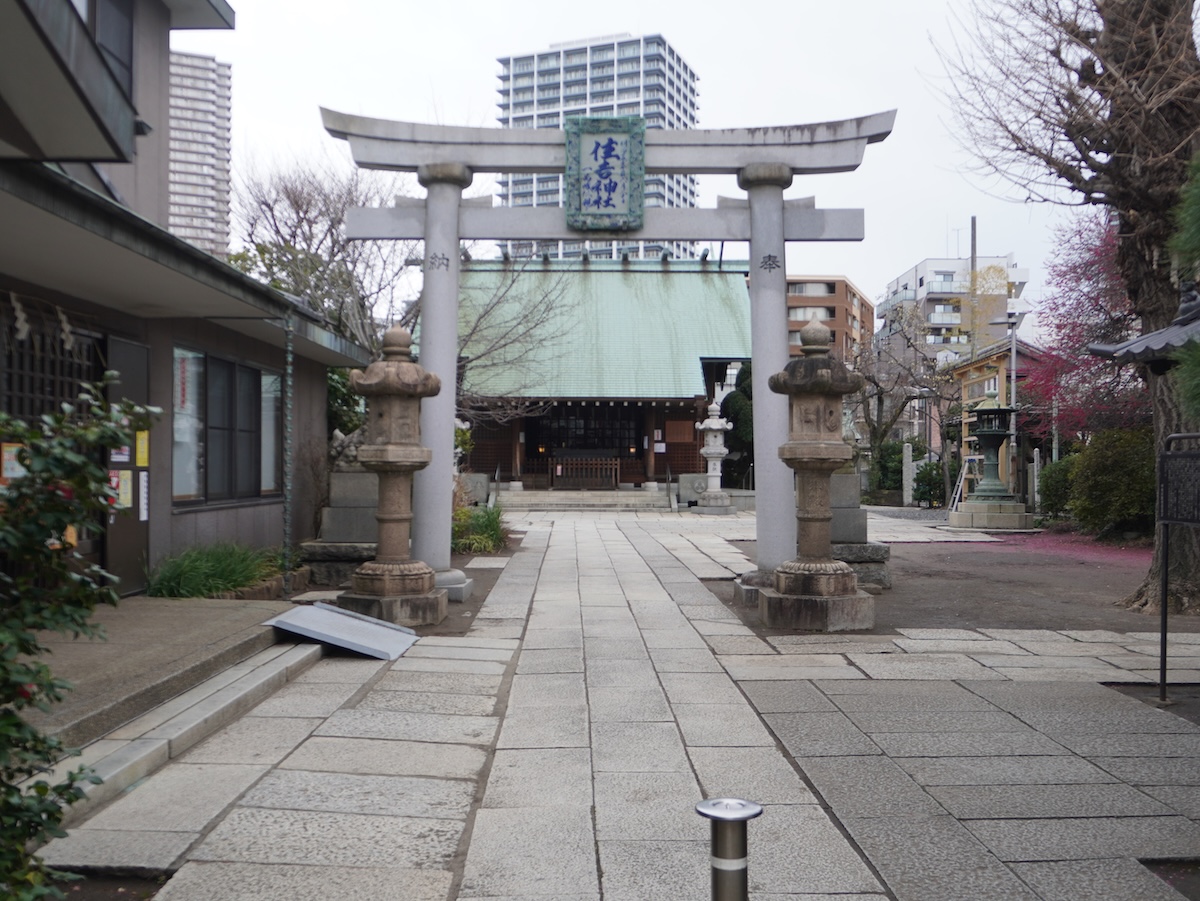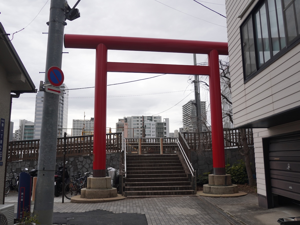 佃公園へと歩みを進めると、大きな鳥居が見えてきました。