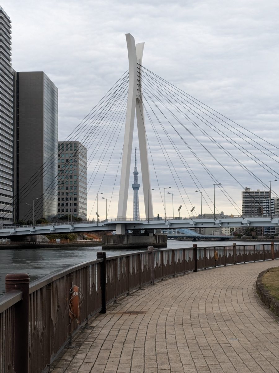 灯台から先は、かつて石川島だったエリアに入ります。川沿いの歩道に降りて隅田川沿いを進み、中央大橋に着きました。隅田川の上流、北側にスカイツリーが見えます。いい眺め。