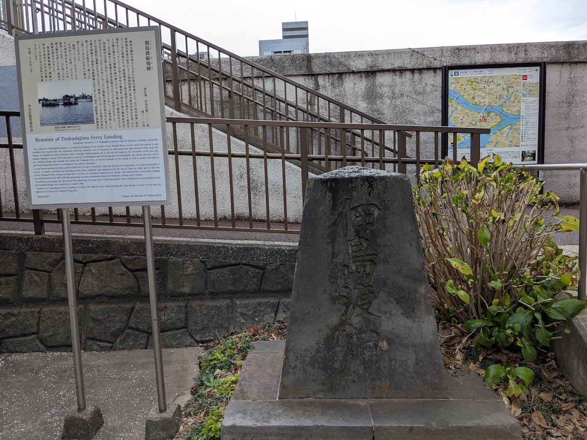 佃大橋から降り立つと下町情緒あふれた家並みが続き、老舗の佃煮屋さんが何軒か軒を連ねています。そこから、隅田川沿いの歩道を佃島公園方向に歩いていきます。前回、中央区湊で見かけた隅田川の渡し船に関する石碑が佃にもあり、ほかにも佃まちかど展示館、北條秀司句碑などがありました。