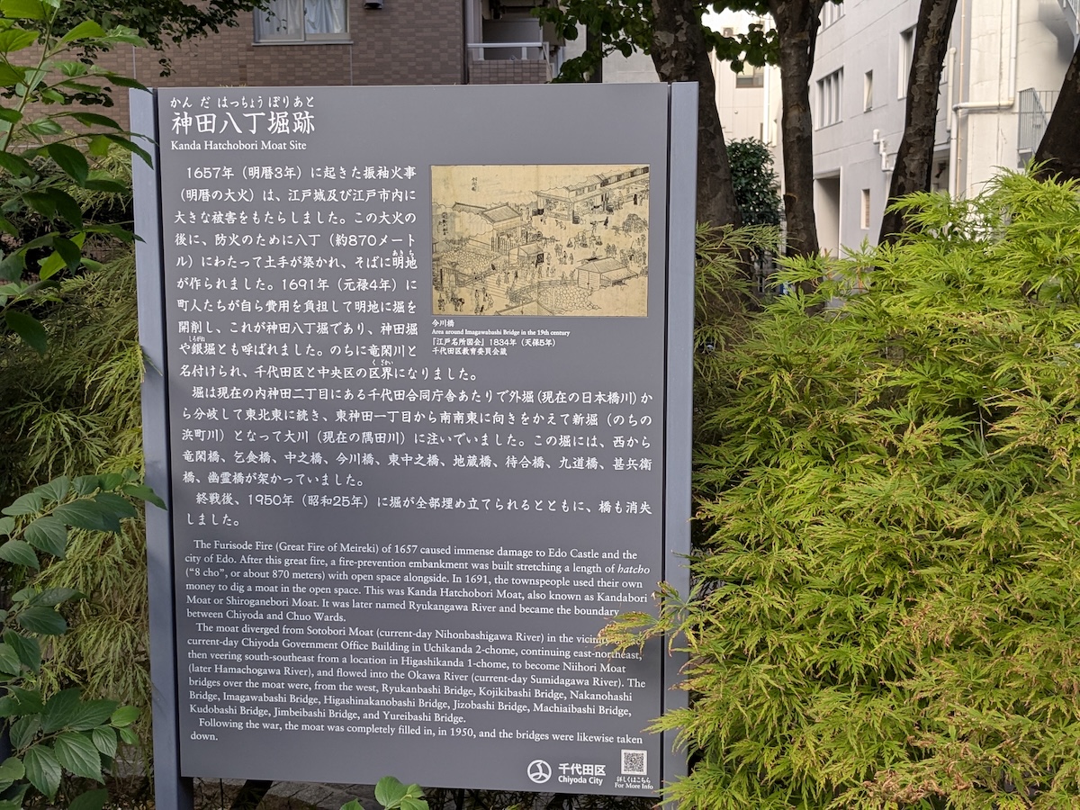 1657年(明暦3年)に発生した明暦の大火の後、江戸市中は大規模な防火対策が敷かれ、当地には長さ八丁(約870m)の防火堤防が築かれました。さらに、1691年(元禄4年)には堤防の周囲に浜町堀(後の浜町川)と繋ぐ掘割が造成されます。新しくできた堀は「神田八丁堀」「白銀町堀」とも呼ばれ、日本橋と神田の境界になっていました。