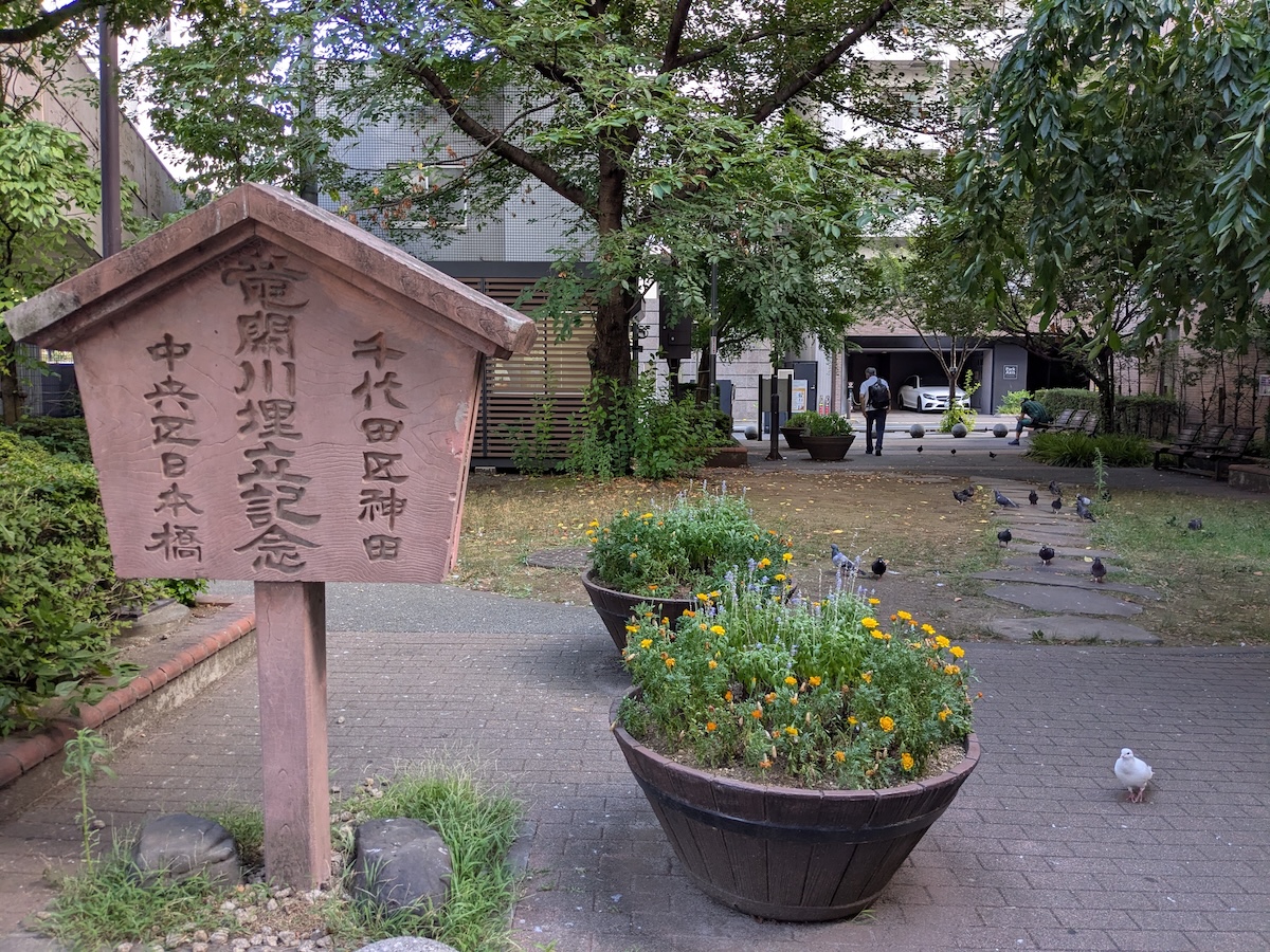 そのまままっすぐビルの谷間の路地を進んでいくと昭和通りにぶつかるのですが、その脇に龍閑川の名残を示すものがありました。地蔵橋公園の一角に建つ龍閑川埋立記念碑です。