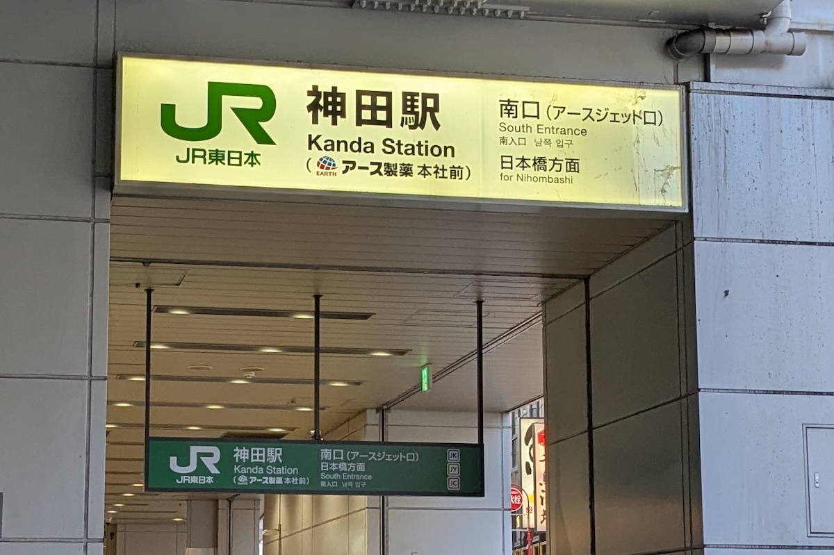今回のターミナス(=トレイルの起点や終点となるアクセスポイント)は、神田駅南口です。駅から外に出て、写真を撮るために駅名標を見上げたら「南口(アースジェット口)」と記されていました。というか、「神田駅(アース製薬本社前)」となっています。