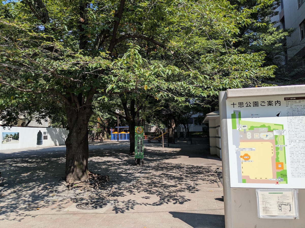 地蔵橋東児童遊園の先も龍閑川(の暗渠)を歩こうと思っていたのですが、一部が工事中で通れない様子でした。そこで、龍閑川から離れ、近くの十思(じっし)公園に向かいました。