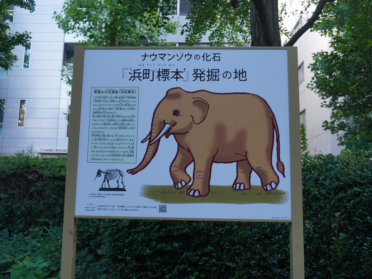 並木道を進んでいくと、象のイラストが描かれた案内板がありました。「ナウマンゾウの化石浜町標本発掘の地」と記されています。