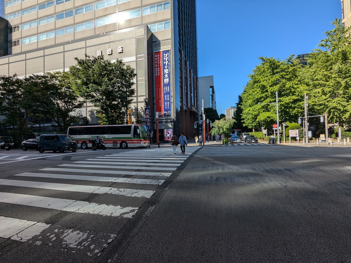 甘酒横丁で浜町川跡の緑道を離れると、大きなビルが見えてきました。数多くの著名人が公演を行っている明治座です。
