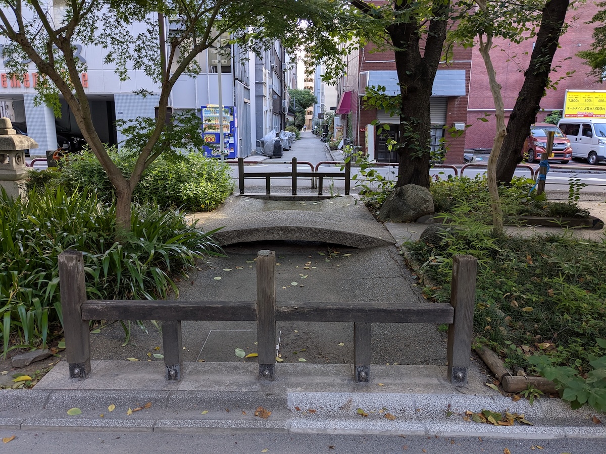 浜町川との合流地点である龍閑児童公園。園内には復元されたものかどうかは不明ですが、橋もありました。