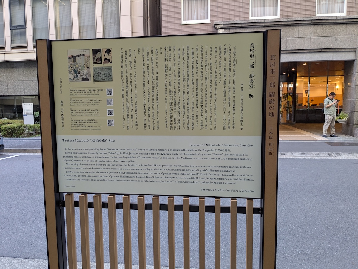 大河ドラマ「べらぼう」でおなじみの江戸時代の出版人、蔦屋重三郎。彼は、もともと吉原大門の近くで書店「耕書堂」を営業していましたが、1783年(天明3年)、ここ日本橋大伝馬町に移転しました。