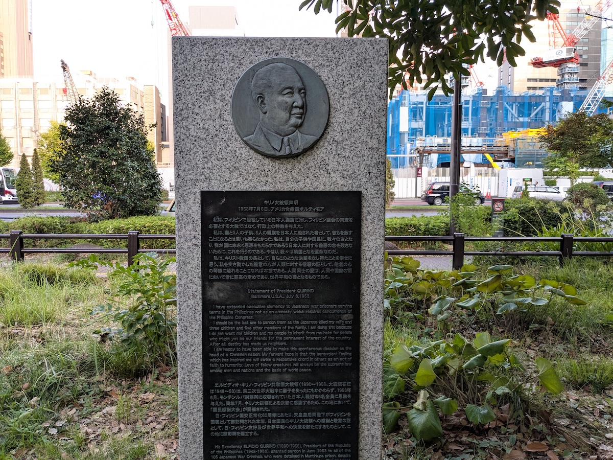 エルピディオ・キリノ元フィリピン大統領は、1953年、フィリピンの刑務所に服役していた100余名の日本人戦犯を恩赦によって釈放。この恩赦は、1956年の日比国交正常化に大きく影響し、日本とフィリピンの友好の礎となりました。こうしたキリノ元大統領の功績をたたえ、フィリピン大使館によってこの顕彰碑が建てられたそうです。