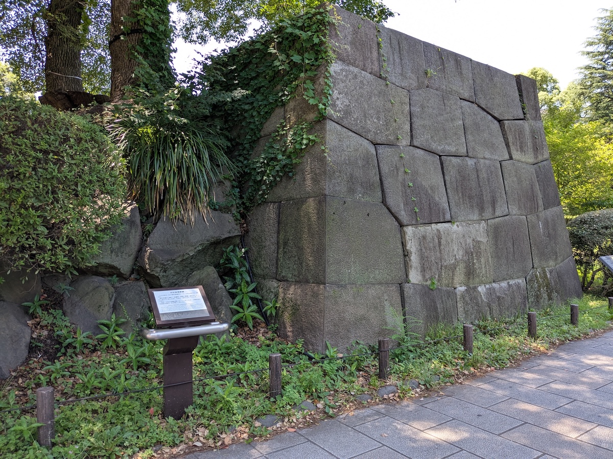 丸の内方面から歩いてくると、日比谷公園の有楽門にたどり着きます。古い石柱が建っている入園口で、ここから園内に歩を進めると、すぐに石垣が目に入ります。これは、かつての江戸城の名残です。