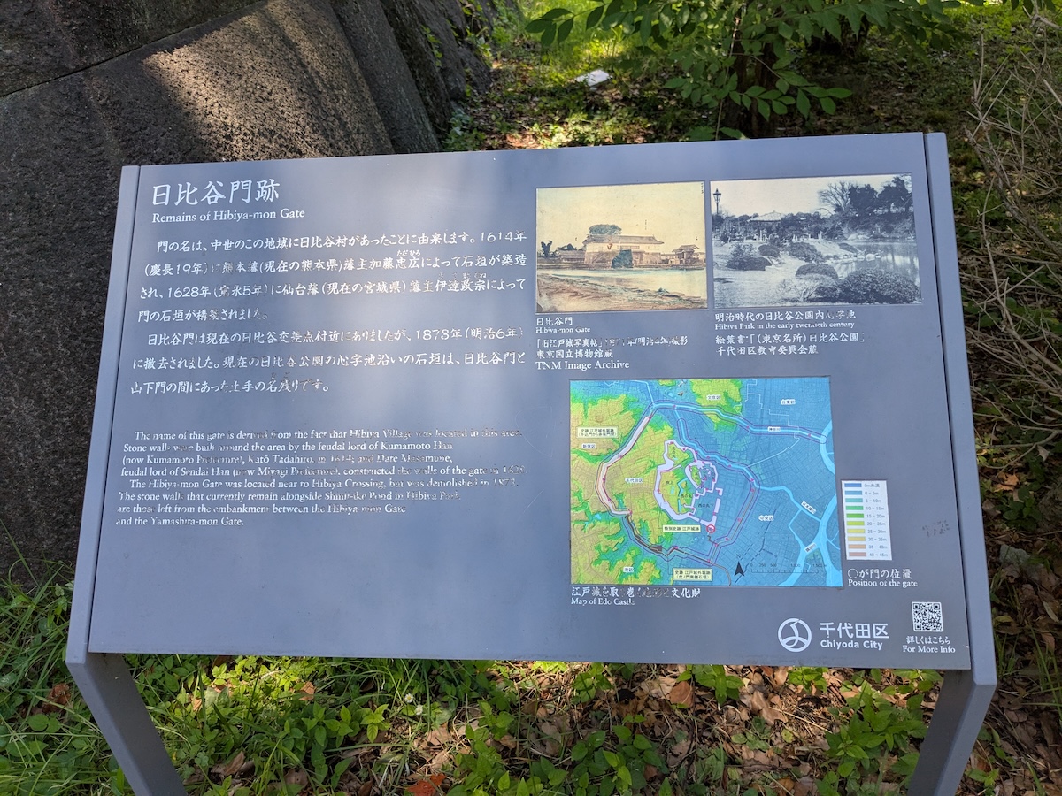 日比谷門は、1614年(慶長19年)に熊本藩主の加藤忠広が周辺の石垣を積み、続いて1628年(寛永5年)に仙台藩主の伊達政宗が門の石垣を構築。案内板に写真が載っていますが、番人の詰め所などを備えたとても立派な建物だったようです。なお、現在の日比谷公園と皇居のお掘りの間には晴海通りが走っていますが、その日比谷交差点付近にもともとの日比谷門があったとか。