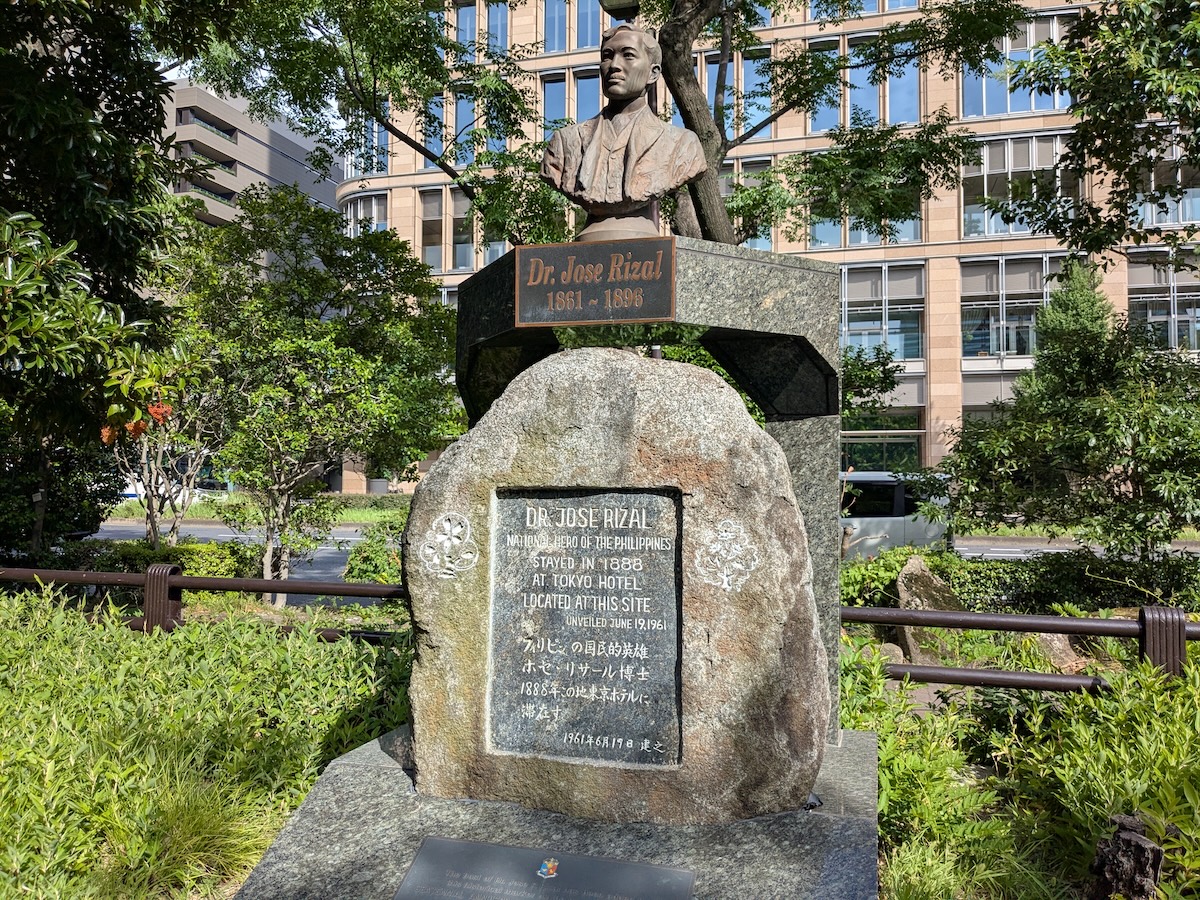 ホセ・リサール博士は、スペインからの独立運動を指導したフィリピンの国民的英雄です。この銅像の碑文には、ホセ・リサール博士が「1888年 この地 東京ホテルに滞在す」と記されています。日比谷にあったホテルに宿泊した記念の銅像?博士と日本との関係は?…など、いくつも「?」が浮かびます。