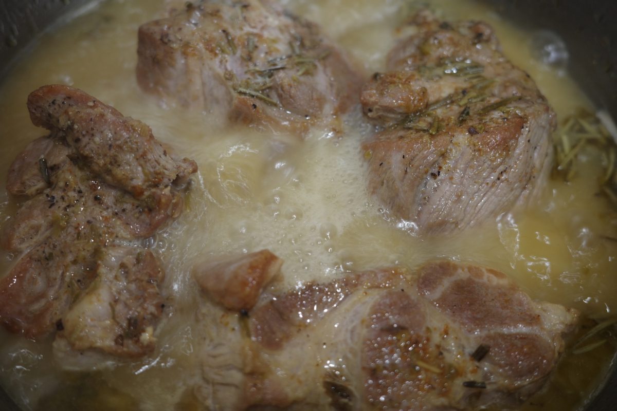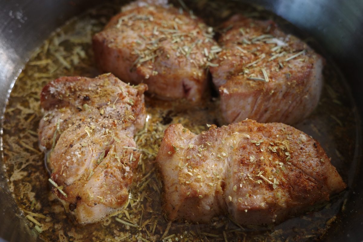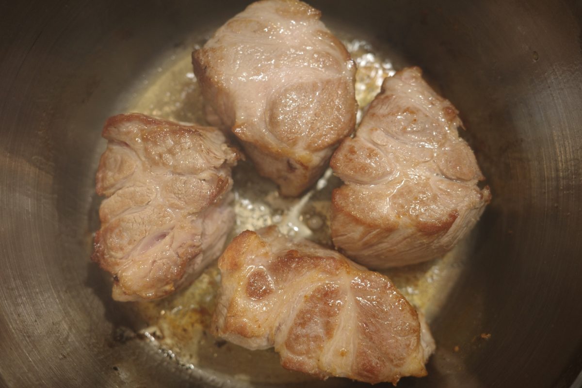 ダッチオーブンなどで、カットした豚肩ロース全面に焼き色がつくまで強火で炒めます。