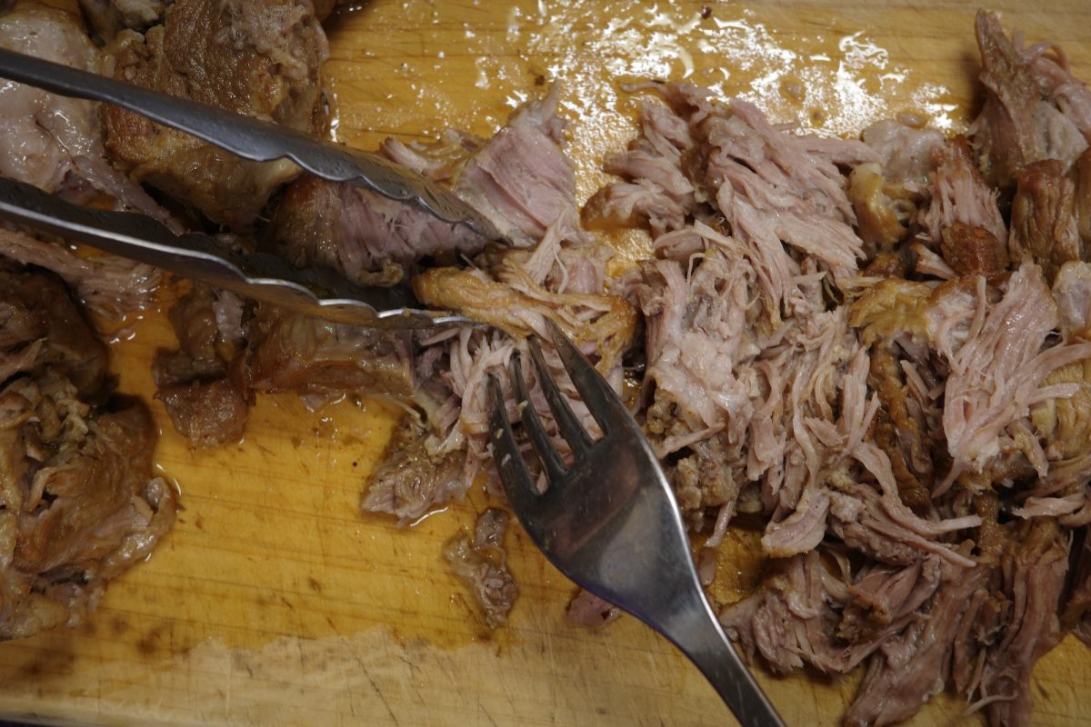 取り出したお肉をフォークなどで細かくほぐして器に盛り付けたら完成です。