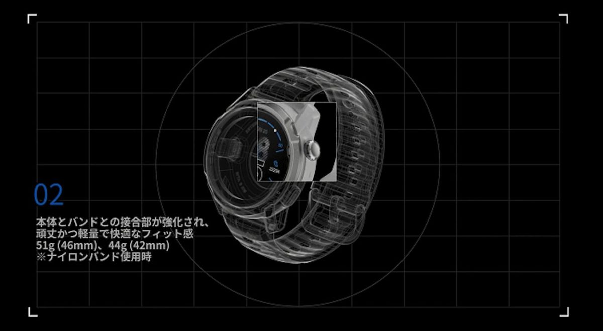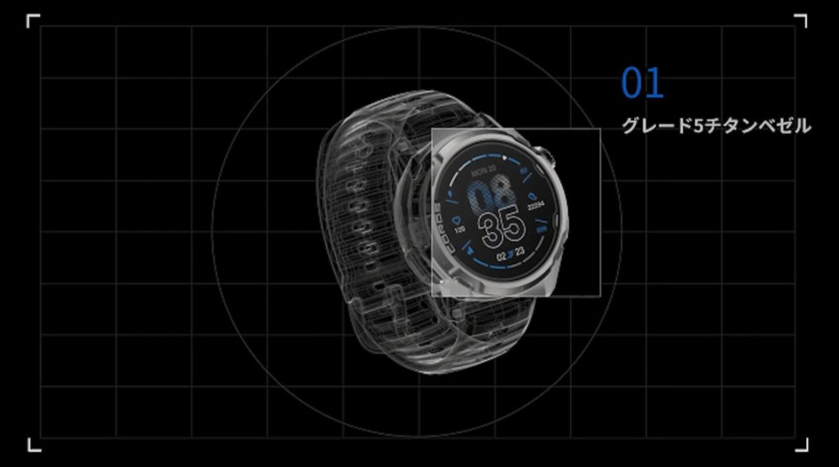 グレード5チタンのベゼルと傷に強いサファイアガラス、さらに本体とバンドの接合部を強化した構造で、タフさと軽さ、そして快適なフィット感を両立させている。