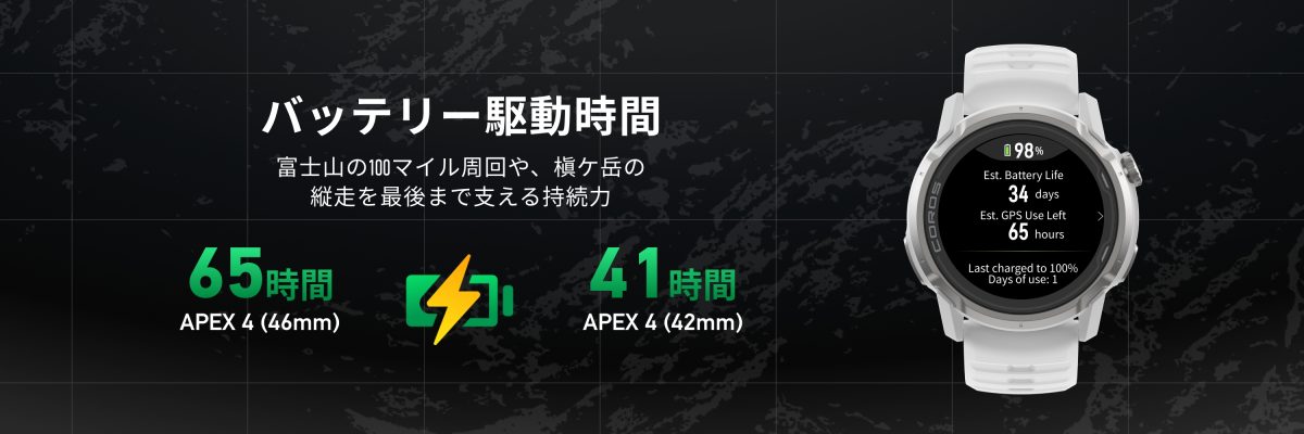 APEX 4は、GPS・ペース・心拍数・高度測定において業界をリードする精度と、COROSならではの超ロングバッテリーを両立。全衛星システムGPSモードで、46mmは最大65時間、42mmは最大41時間の駆動する。
