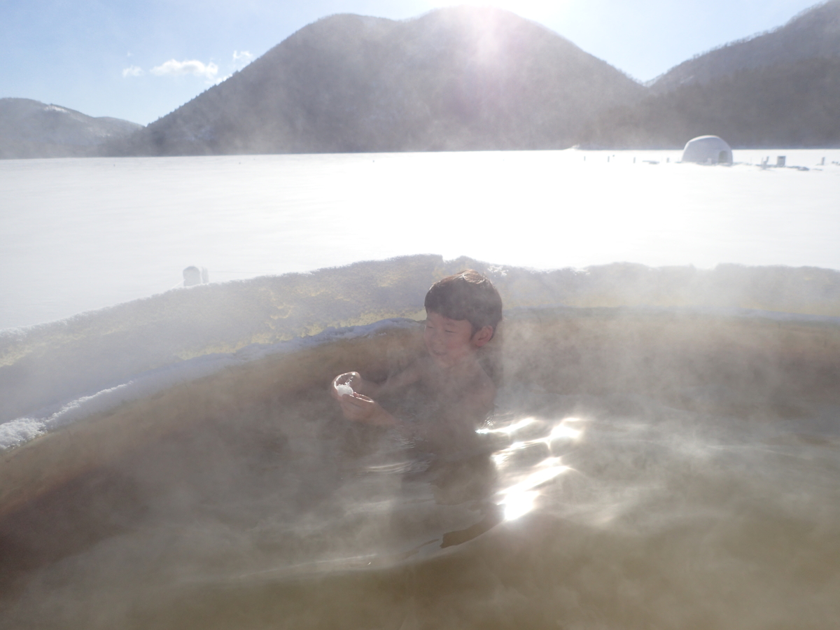 こんにちは、子連れライター渡部郁子です。幼稚園児の息子ハルを連れて、冬の間だけ現れる雪と氷の村「しかりべつ湖コタン」を訪れました。氷上に作られた露天風呂という、なんともワイルドな温泉があるらしいとのことで、冬ですが、水着を持参して、行ってきました北海道。