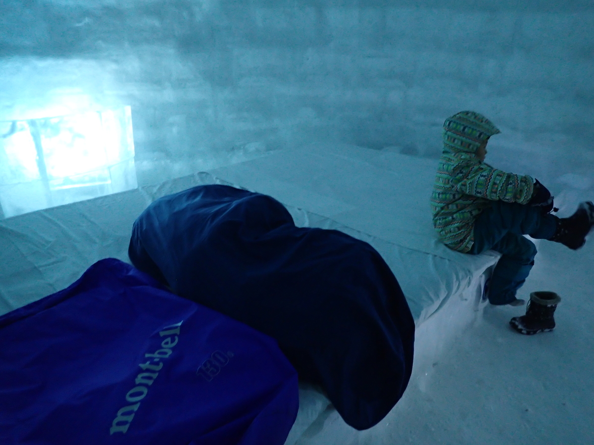 私がトイレに行く間、この氷の部屋に息子を置いて行っていいだろうか。普通の部屋なら迷うまでもなく置いていきますが、ここは氷の部屋。置いていかずに連れていくとして、寝ている息子を背負ったままトイレをすますことができるだろうか。そもそも、極寒仕様の寝袋は大きすぎて、息子を寝袋に入れたまま背負うことはできそうもない。さてどうしよう。