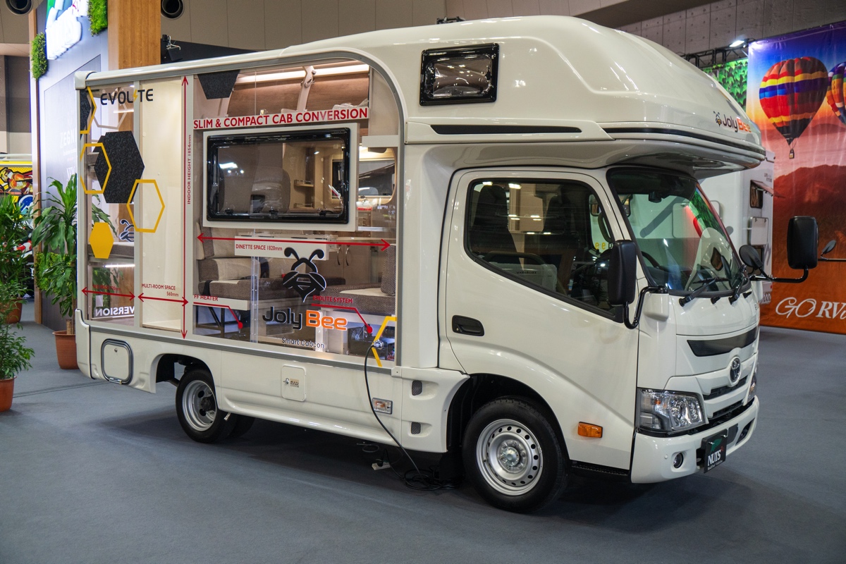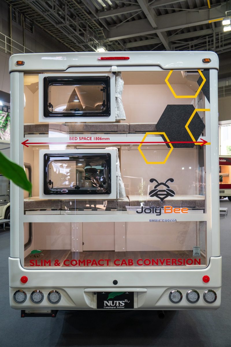 国内大手ビルダーのナッツRVはキャブコンと呼ばれるキャンピングカーのスケルトン仕様を展示し、キャンピングカーの内部がどうなっているかを車外からでも分かるような面白い展示を試みています。