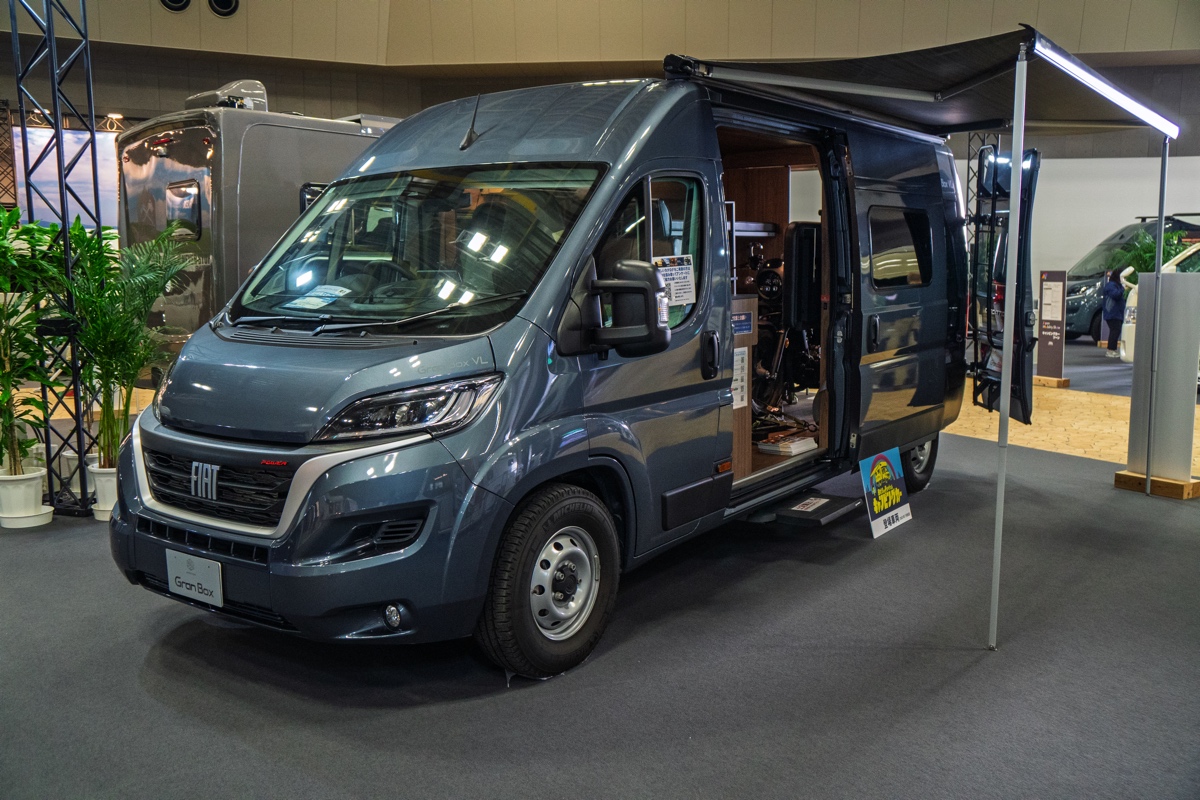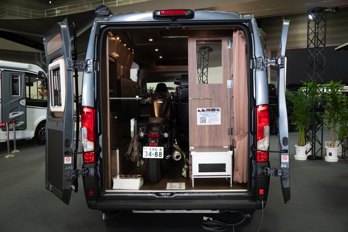 ここ数年で国内台数を伸ばしているのが、日本でも正規輸入がされておりメンテナンスも含めてサービスが整っている、フィアット・デュカトをベースにしたキャンピングカー。軽キャンパーで人気の「ミニチュアクルーズ」シリーズを販売する岡モータースは「Gran Box L3 TP」を展示。モデル名のTPはトランスポーターの意味でオートバイや自転車を積んでの旅を想定して製作。写真のように荷室左側にバイクを積んだまま、右側に2段ベッドで快適な就寝が行える設計。また、最後部にはトイレや着替えができるマルチルームも装備しています。