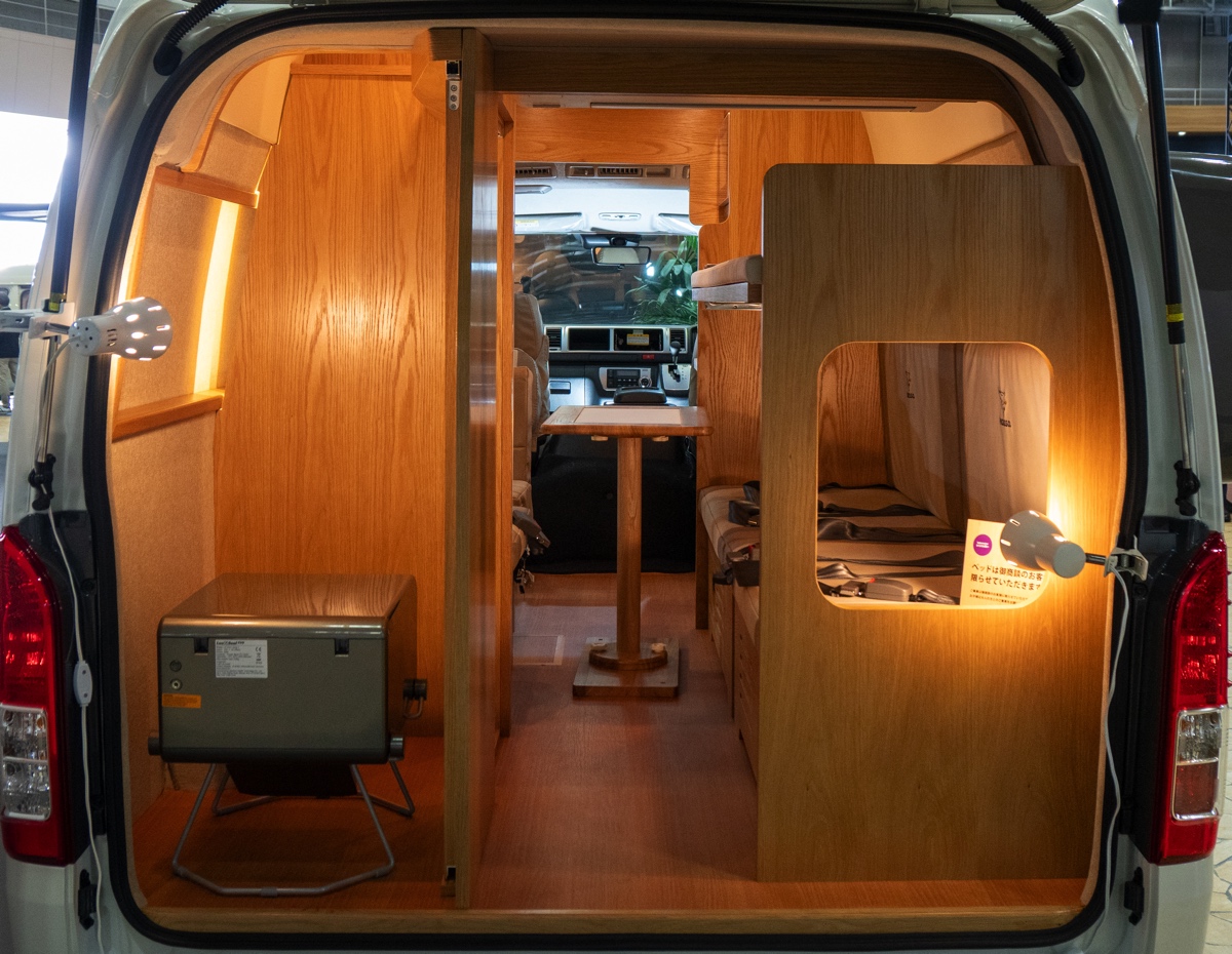 気になるのが室内。室内長のゆとりがワンボックス車の魅力のひとつですが、セミキャブオーバーにすることで室内長が短くなってしまう……。それをクリアするために助手席を脱着式にすることで、約2.4mの8尺脚立が余裕で収まる室内長を確保。それでもキャンピングカーのベース車として考えるのであれば、スーパーロングやワイドといったさまざまなボディバリエーションの展開も期待したいところです。