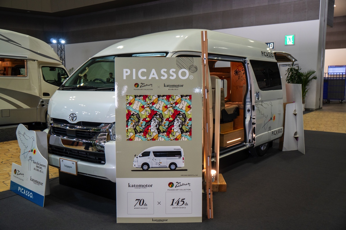 キャンピングカーのベース車として定番のハイエースでは、カトーモーターが世界的画家として知られるパブロ・ピカソとコラボした「PABLO」を展示。既発のチップアップをベースにハンドクラフトによるていねいな作りの家具に加え、車内外にはピカソのアートが随所に描かれているのがポイント。ピカソの生誕145周年とカトーモーターの創業70周年という節目の年を記念した、機能とアートが融合された特別な1台です。