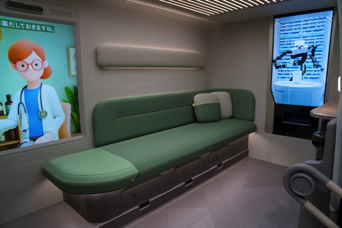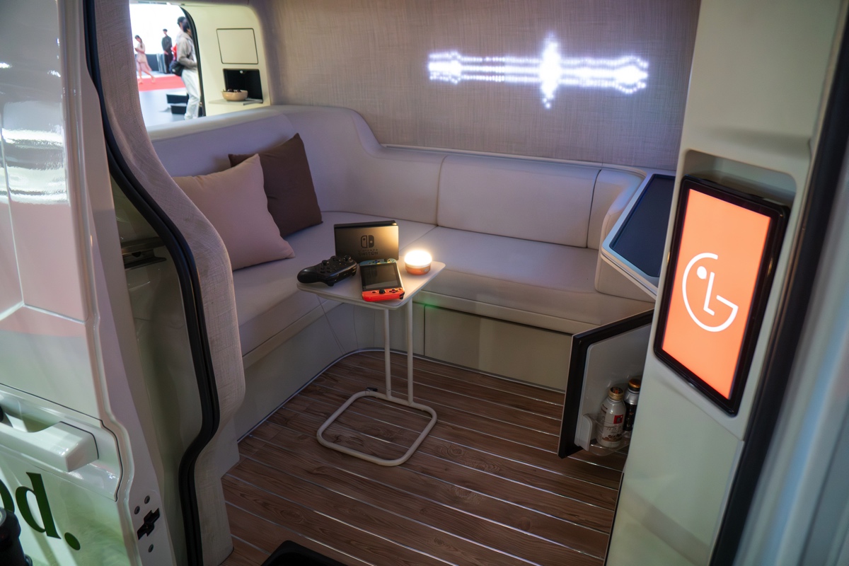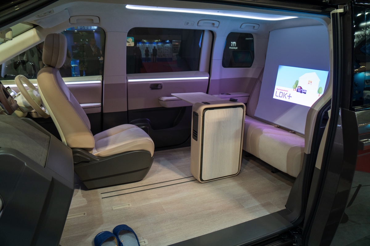 家電メーカーとして知られるシャープが展示した「LDK+」は自社でクルマを製造するわけでなく、車内環境をトータルで提案。ベース車には台湾の自動車メーカーである鴻海科技集団(フォックスコン)の「Model A」というEVを使用。同社によると、乗用車は駐車している時間が約95%もあり、そうした時間を空間として活用できるのではと考えて製作。