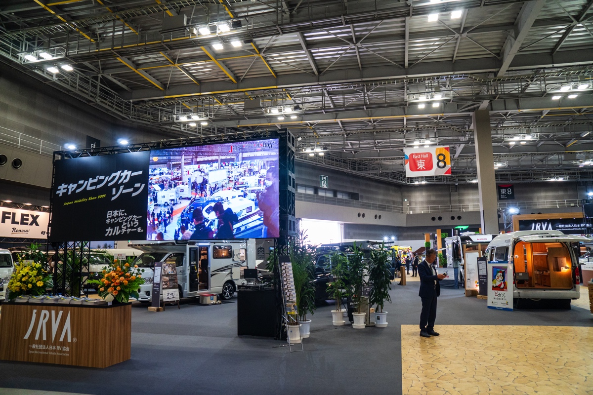 東京ビッグサイトの東・西・南ホールと広大なスペースで開催されているJMSですが、東8ホールすべてを使い、日本RV協会(JRVA)による「キャンピングカーゾーン」が登場。「GO RVing」をテーマに、クルマでの旅の楽しさはもちろんのこと、防災やレンタルキャンピングカーといった活用法など、軽キャンパーからフルコンバージョンまでさまざまなジャンルのキャンピングカーを最新モデル40台が展示されています。