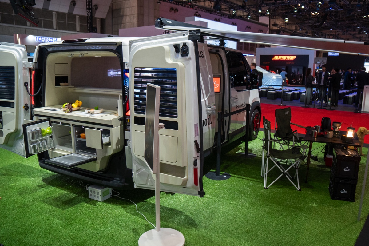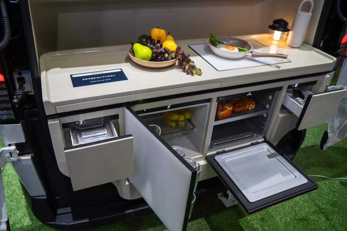 会場では上記の2モデルのほかにも、韓国の家電メーカーLGと製作した参考出品のキャンピングカー「LG Spielraum」を展示。Spielraumは「遊びの空間」というドイツ語で、こちらは冷凍・冷蔵庫のほかにも、L字ソファを装備し、優雅なラウンジを演出。キャンピングカーのベース車両としてのポテンシャルを紹介していました。