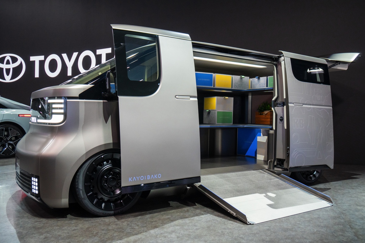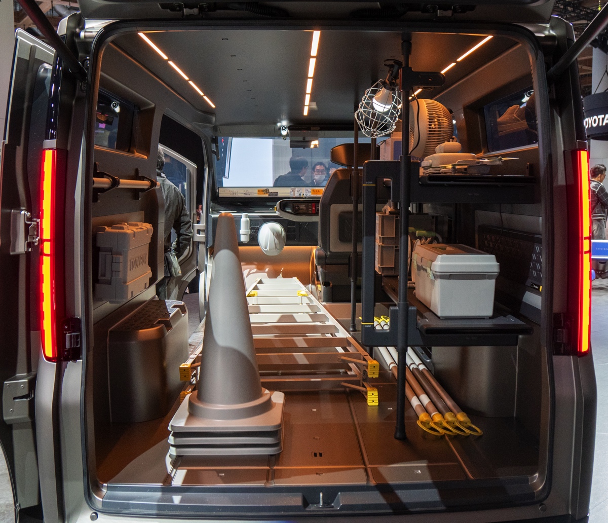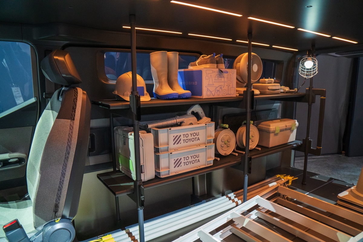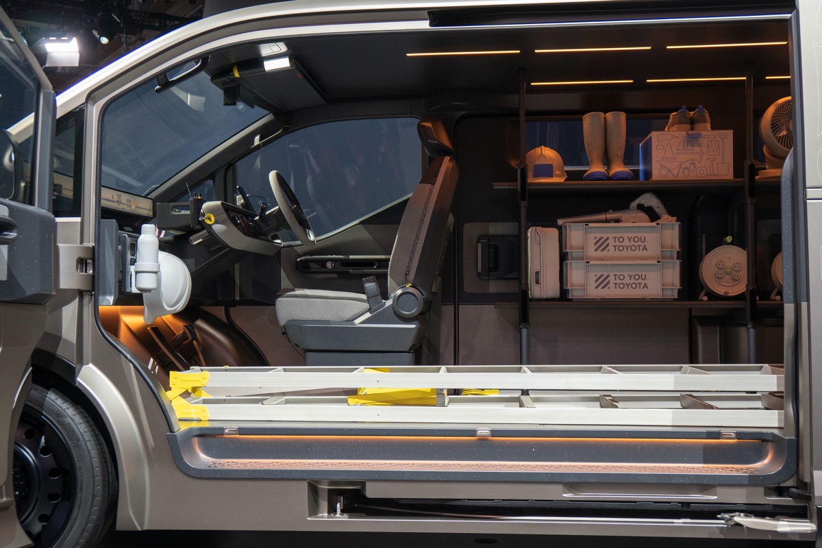 そんなカヨイバコのデザインを引き継ぎつつ会場を賑わせたのが「ハイエースコンセプト」。現行の200系と同様のボディサイズである標準ルーフと、300系と同様のハイルーフを展示。カヨイバコのほうはEVが前提でしたが、説明員の方に質問するとハイエースコンセプトのほうはEVだけでなくハイブリッドやエンジン車なども想定しているそう。