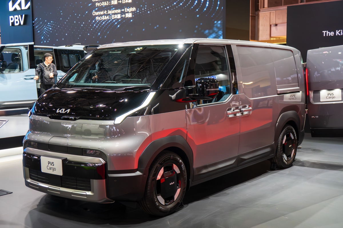 ここ最近、デザイン性の高さと合わせ、世界的に評価されている韓国のKia(キア)が「PV5」を初展示。現在、日本では商用車のEVバンにおいて、三菱・ミニキャブEVやホンダ・N-VAN e:といった軽自動車に加えて、日産・e-NV200があります。また、輸入車ではフォルクスワーゲンのID.BuzzがEVとして販売されています。このPV5はミニバンタイプの「パッセンジャー」と貨物用「カーゴ」の2モデルをラインナップ。サイズは全長×全幅×全高:4695×1895×1930mmでハイエースのワイドボディよりも車幅があるものの、長さは標準ボディと同じサイズです。