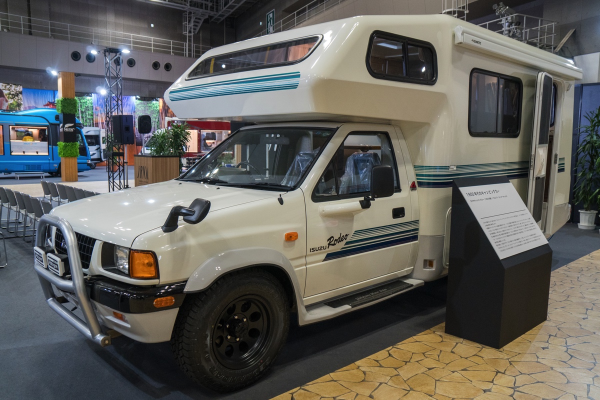 ほかにも、キャンピングカーの歴史がわかる展示として、今から約30年前の1994年に製造されたヨコハマ・モーターセールスのロデオにも注目。ロデオは日本のキャンピングカーシーンにおいて草分け的なモデル。累計販売台数1200台以上を記録した、1980〜90年代を代表するモデルのひとつです。時代を感じさせない美しさはナッツRVによるレストアによるもの。