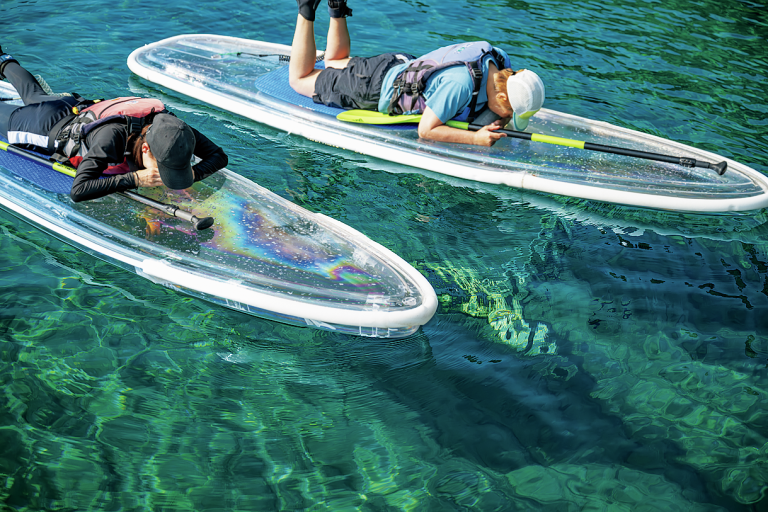SUPは不安定な水面でバランスをとるので、体幹が鍛えられエクササイズ効果を期待できるのも魅力。穏やかな海面を見渡したり、風や波の音をゆったりと感じたり、島から島へと渡ったりと、多彩な楽しみ方ができるのも人気の理由だ。