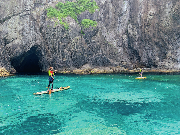 そんな絶景スポットにある青の洞窟までSUPで漕ぎ出し、洞窟内を探検。波の穏やかな場所ではシュノーケリングもOK。レクチャー付きで安定感抜群のボードを使うので、年代を問わず、初心者も楽しめる。