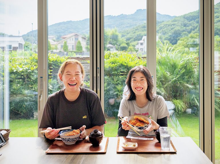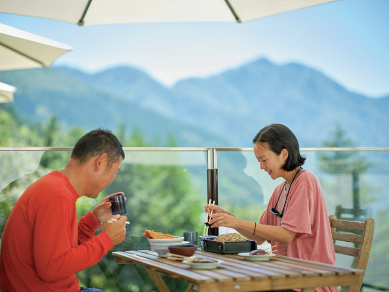24席のテラスは、相席必至の人気。秩父の山並みを眺めながら、更紗さんは冷たい「くるみ汁そば」900円、小川さんは「わらじかつどん」1,100円で満腹。