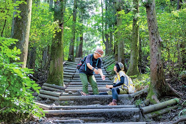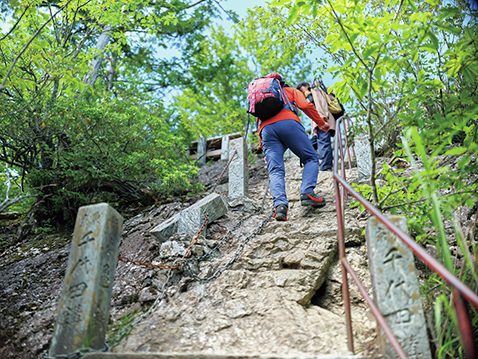 登山道直下にある、名物の200段階段。登りもキツイが、急斜面で降りるのもドキドキ。
