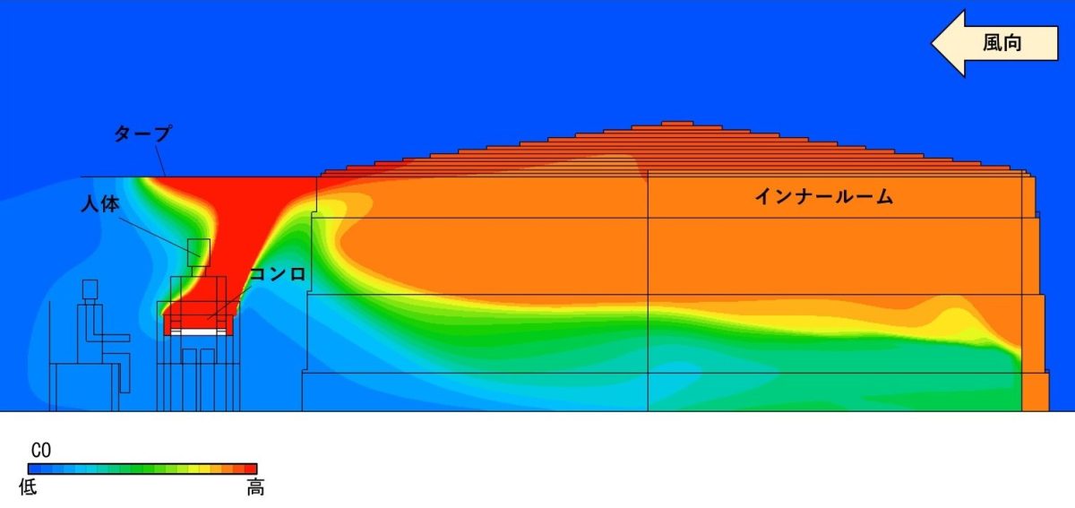 解析の結果、屋外で発生した一酸化炭素が風の流れに乗ってテント内へ侵入し、天井付近だけでなく頭部の高さにも滞留することが判明した。目に見えず無臭のCOは「屋外なら安全」という思い込みを簡単に裏切るのだという。