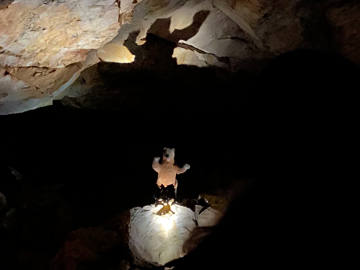 洞窟内を歩き始め5分ほど経ったとき、いきなり大きなクマのぬいぐるみが照らし出されました。