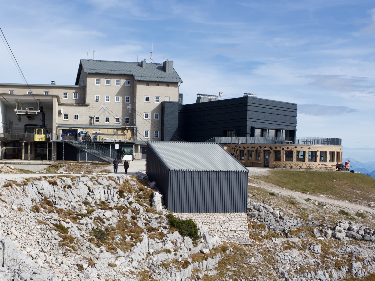 写真左側がケーブルカーの発着所、右に見える低い木目、円柱型の部分がレストラン。