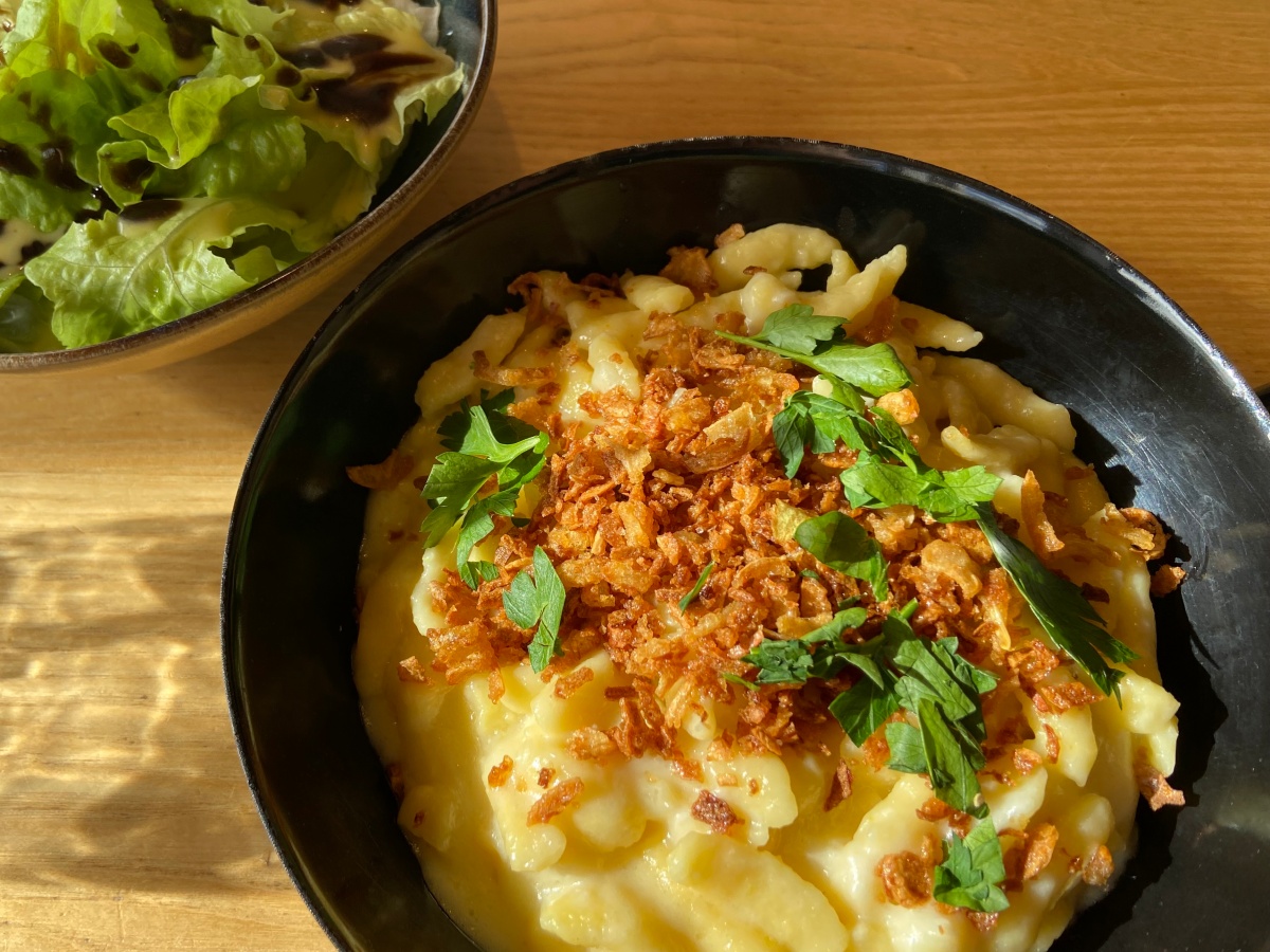 食事は南ドイツやオーストリアのショートパスタ、シュぺッツレにたっぷりのチーズを載せてオーブンで焼いたものを注文しました。しっかりした味付けにカリッカリの玉ねぎと大胆に刻んだパセリ。このパセリの力強さがアクセントになっていて最高。そしてグリーンサラダ。正直どこのレストランでもシュペッツレは盛り付け量がとても多いのです。見た目は少ないのですが、チーズも贅沢に使われているのでお腹にたまるんですよね。