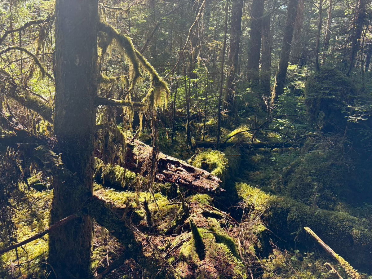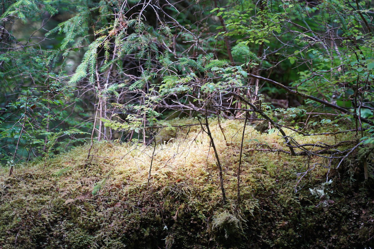 いつしか、あたりはツガやトウヒ、ヒノキが混生する原生林になっていた。木々は枝先まで地衣類に覆いつくされ、地面には歩くのが大変なくらい、たくさんの倒木が横たわっている。古い墓場のようにも見えて、少し寂しくなった。