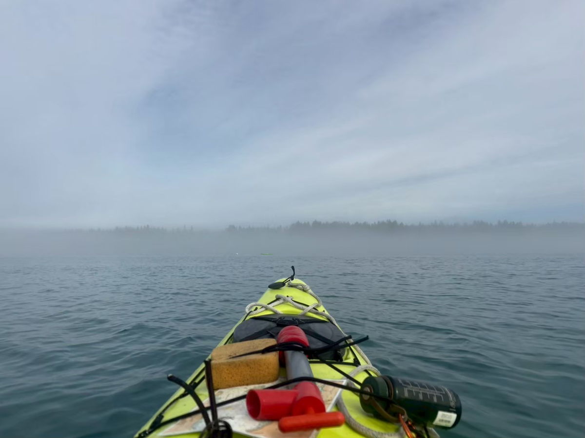 湖のように静かな湾をカヤックで進んでいると、小さな浜を見つけた。人間の気配はまるでない。浜辺に腰を下ろしてしばらく佇んでいると、遠くのほうでザトウクジラが海面から背中を出して、空高く潮を吹き上げた。