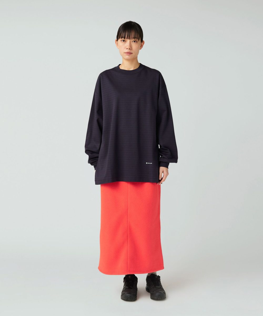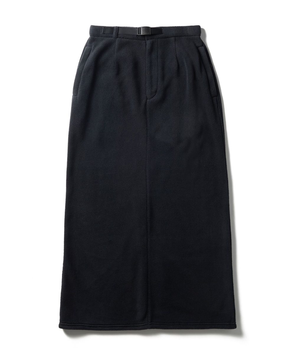 こちらは女性用のロングスカート。柔らかな生地感で動きやすく、後ろ中心のベントが足さばきをサポート。脇にはファスナー付きポケットを配置しており、座ったときの収納物の落下を防止する。