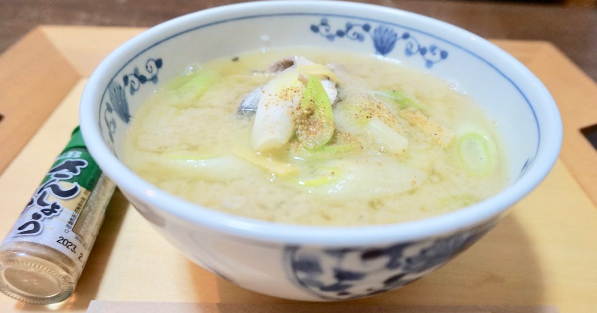 【2】器でお湯、鶏ガラスープの素、ゆず胡椒、塩を混ぜてスープを作ります。