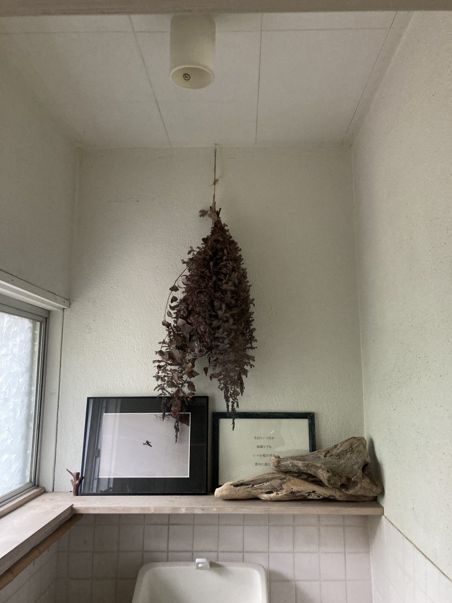 お手洗いの正面はアートや流木と一緒に、ミモザとユーカリのミックスを飾っています。