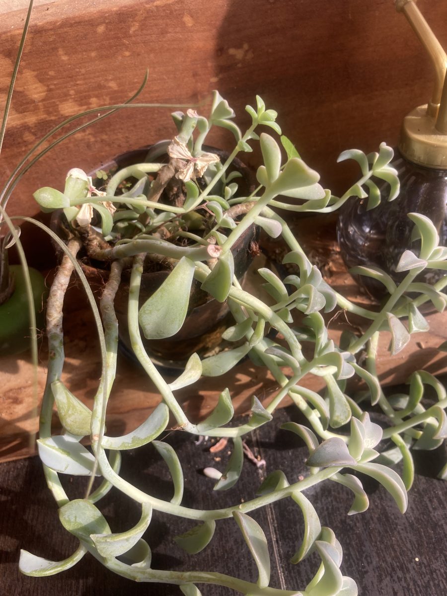 庭先に放り出されて誰も見向きもしなくなっていた「ルビーネックレス」は、無理やり戸外で越冬していたため、鉢の中でほとんど虫の息でしたが、土を替えてスタジオに連れ帰り、チランジアの隣に置いてみたところ、みるみるうちに元気を取り戻し、気をてらった盛り付けのチャーシューメンみたいに、今では鉢から大きく飛び出すほどにまで。なんて生命力なのでしょう。